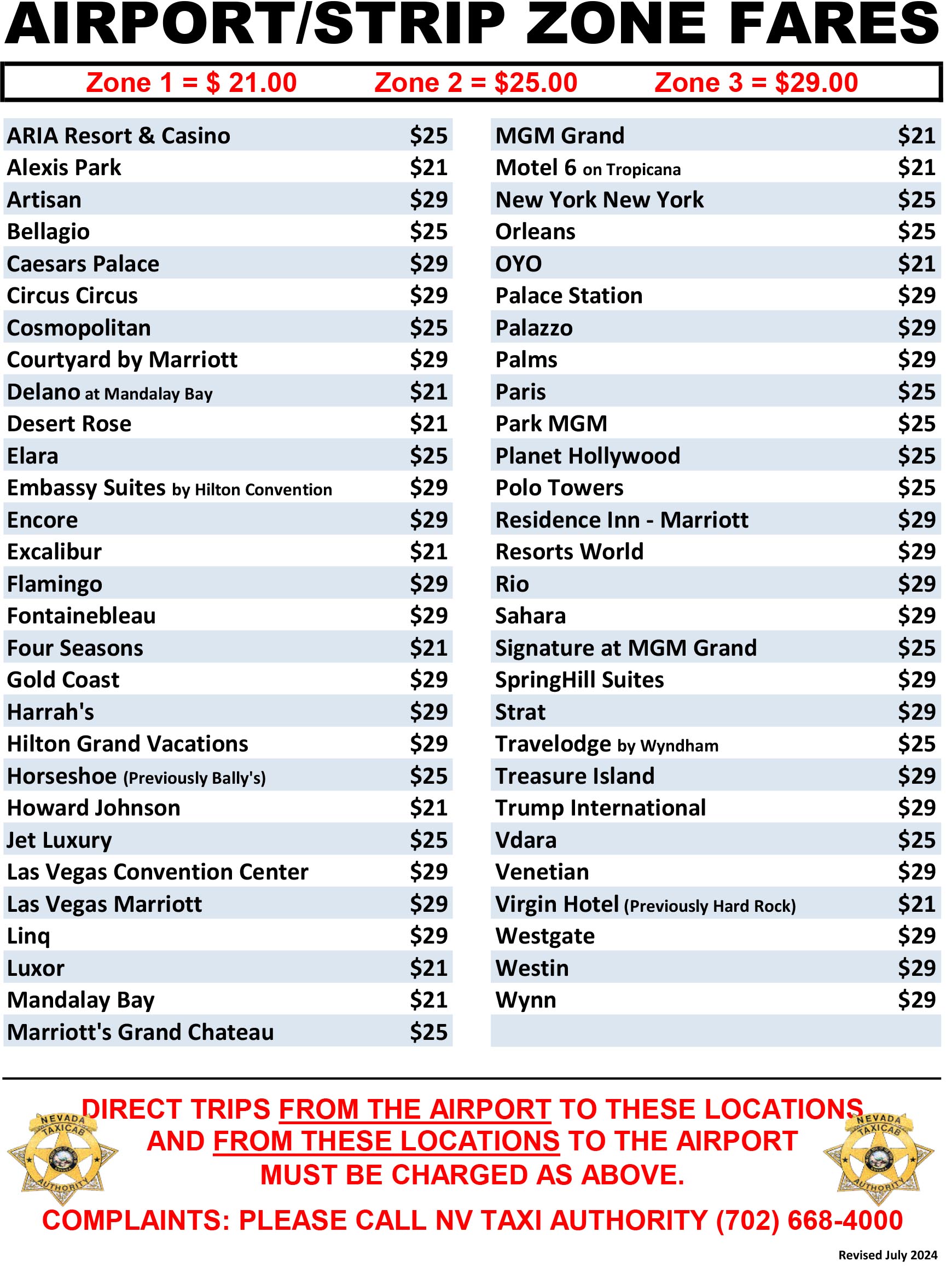 For rides between hotels and other locations, refer to the Nevada Taxicab Authority rates below: